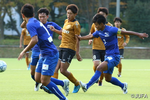 試合は開始直後に動いた。9分、日体大11番・平川元樹が10番・里見直樹とのワンツーで関学大のディフェンスラインの背後を取る。抜け出した11番・平川が冷静に流し込み、日体大が先制点を獲得。日体大はその後も、10番・里見や9番・渡邊龍らが個人技を活かして関学大のゴールに迫るも、追加点には至らない。一方の関学大は、24番・北村椋太の精度の高いロングボールを起点に攻撃のスイッチを入れるが、なかなか突破口が見いだせない。逆に日体大の3番・原田亘、24番・清水颯人に右サイドを制圧されてしまう。関学大はセットプレー、日体大はボールポゼッションとそれぞれの形でゲームを展開するが、柄点はなく1-0のまま前半は終了する。