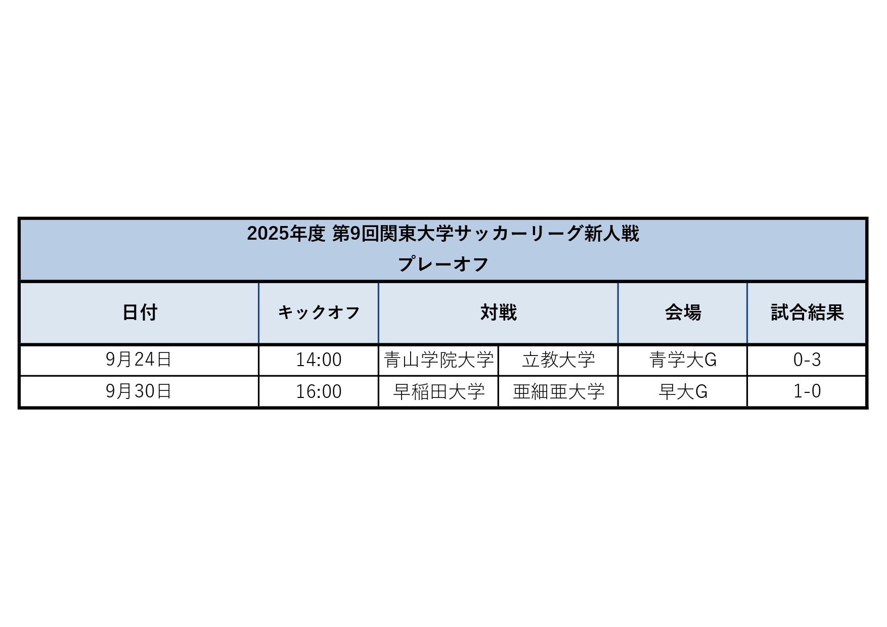 9月24日、9月30日に開催されました『2025年度 第9回関東大学サッカーリーグ新人戦 プレーオフ』の結果をお知らせいたします。