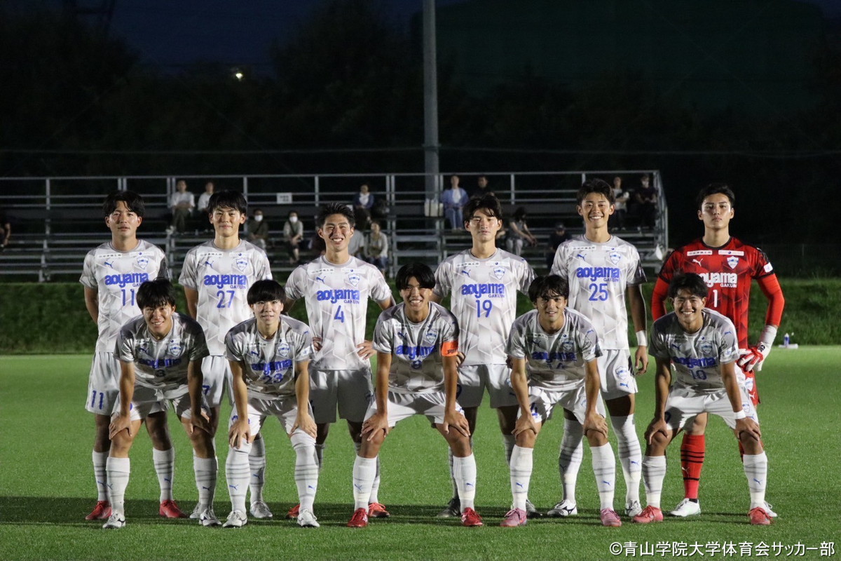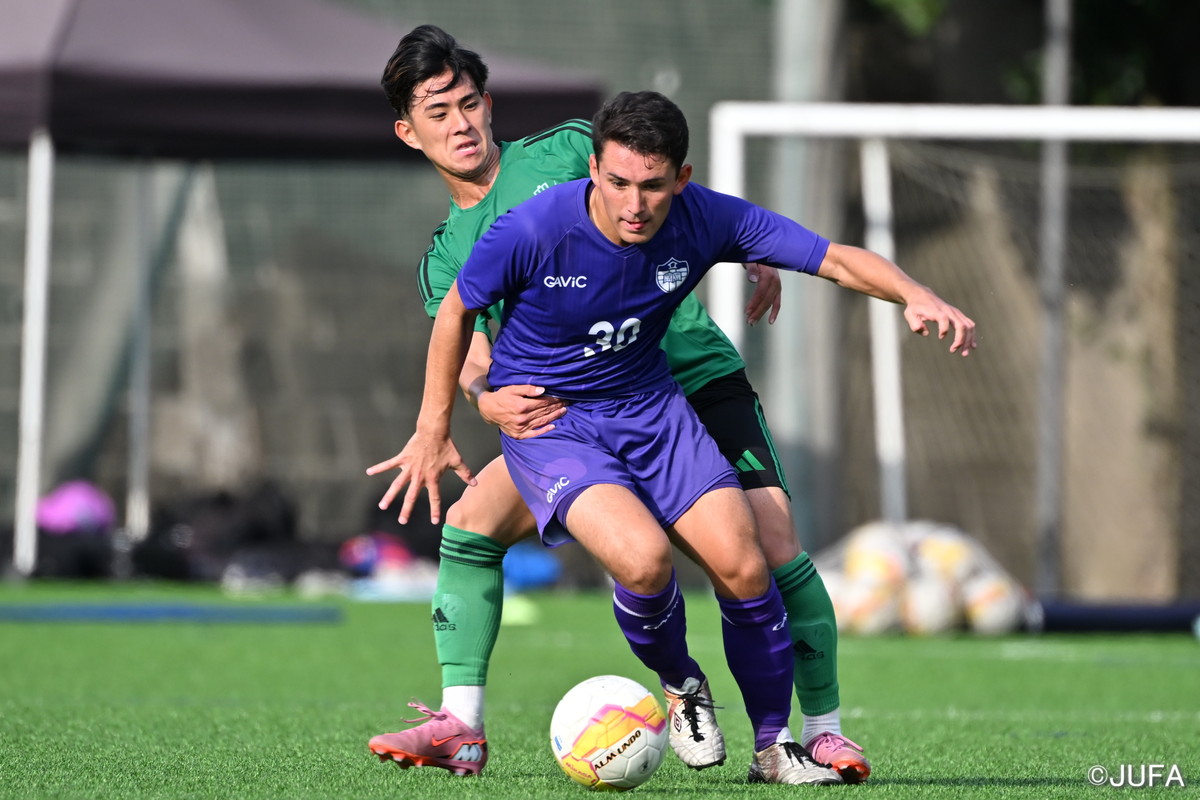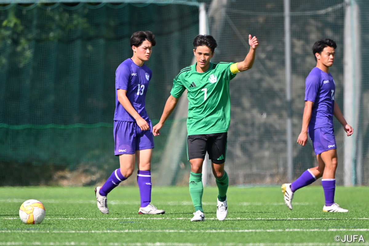 翌28日(日)は、勝点23で並ぶ首位・城西大学と2位・青山学院大学が激突。勝ったほうが優勝戦線から一歩抜け出すことのできるとあって、試合は両チーム慎重な入りに。前半は一進一退の展開となり両チーム無得点のまま後半へ。すると60分、青学大はフリーキックを獲得すると金子星太のキックに木村匠汰が走り込んでボールをキープ。すかさずゴール前にクロスを入れると、これを森夲空斗が頭で押し込み先制点を挙げる。だが城西大も69分に左サイドから仕掛けると、スルーパスに反応した杉本悠が体勢を崩しながらもGKとの一対一を制して同点に追いつく。その後は両チーム、メンバーを入れ替えて流れを引き寄せようとするが、決定機を作れないまま1-1で試合終了。首位攻防戦はドロー決着に終わり、ともに勝点1を積み上げるに留まった。