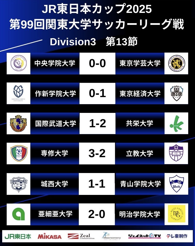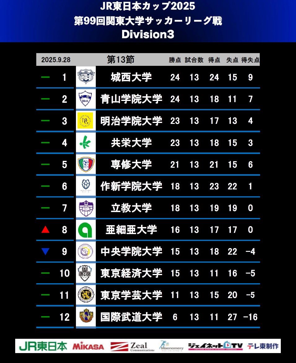 『JR東日本カップ2025 第99回関東大学サッカーリーグ戦』3部リーグ第13節は、9月27日(土)に3試合、28日(日)に3試合が行われた。
