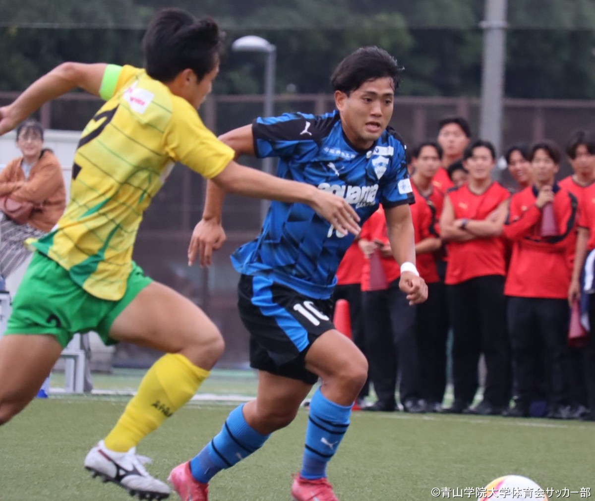もうひとつの上位対決、2位・青山学院大学と4位・共栄大学の試合は、立ち上がりから青学大が優位に試合を進める展開に。共栄大は33分、五木田瑠樹亜が怪我でピッチを退くアクシデントがあったものの、代わりに入った斉藤巧志がチャンスを演出。しかしどちらも決めきれず0-0のまま後半を迎えた。なかなか動かない試合に対し、青学大は55分に大里直也と田口裕真のふたりを同時投入して試合の流れを変えようとするが、膠着状態の試合は動かせない。結局、どちらもゴールを揺らすことなくスコアレスドローで試合終了。勝点1を分け合った。青学大は2位をキープも、首位との勝点差は1に。共栄大は上位チームの結果の影響もあり4位・城西大と同勝点ながら得失点差で5位に後退した。