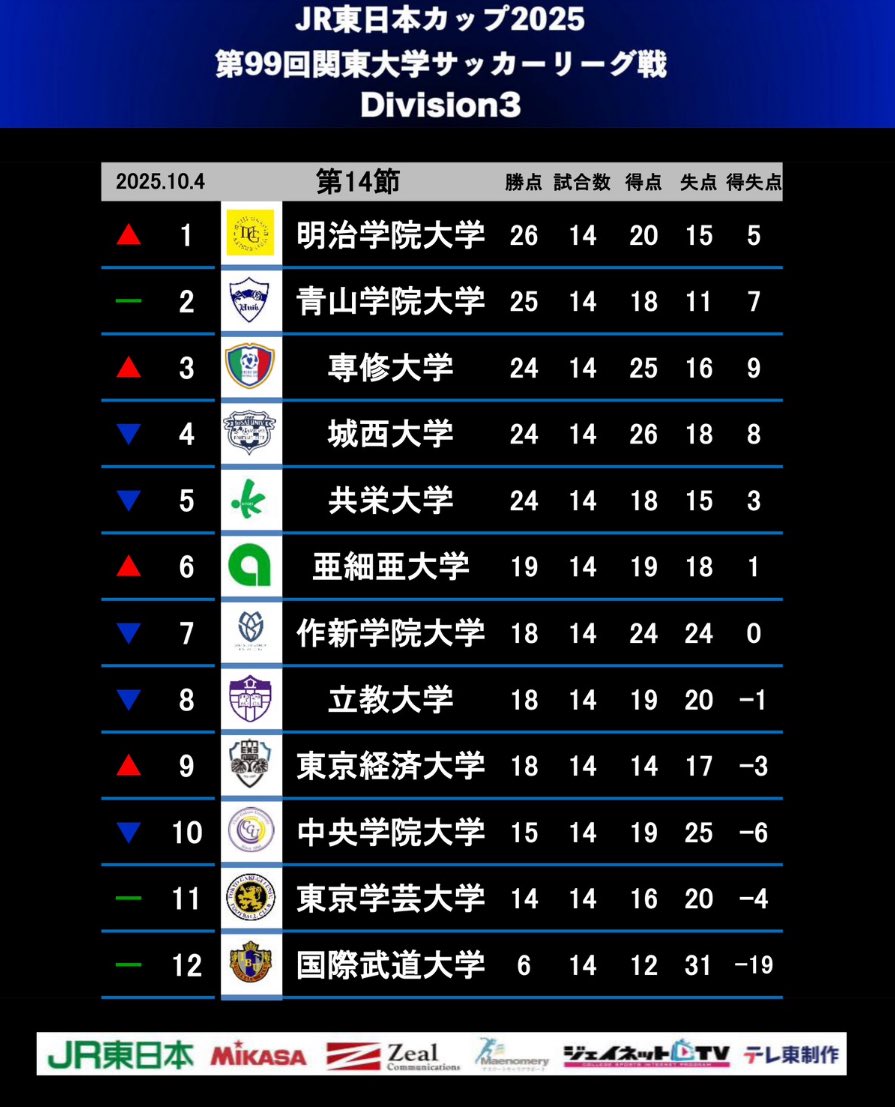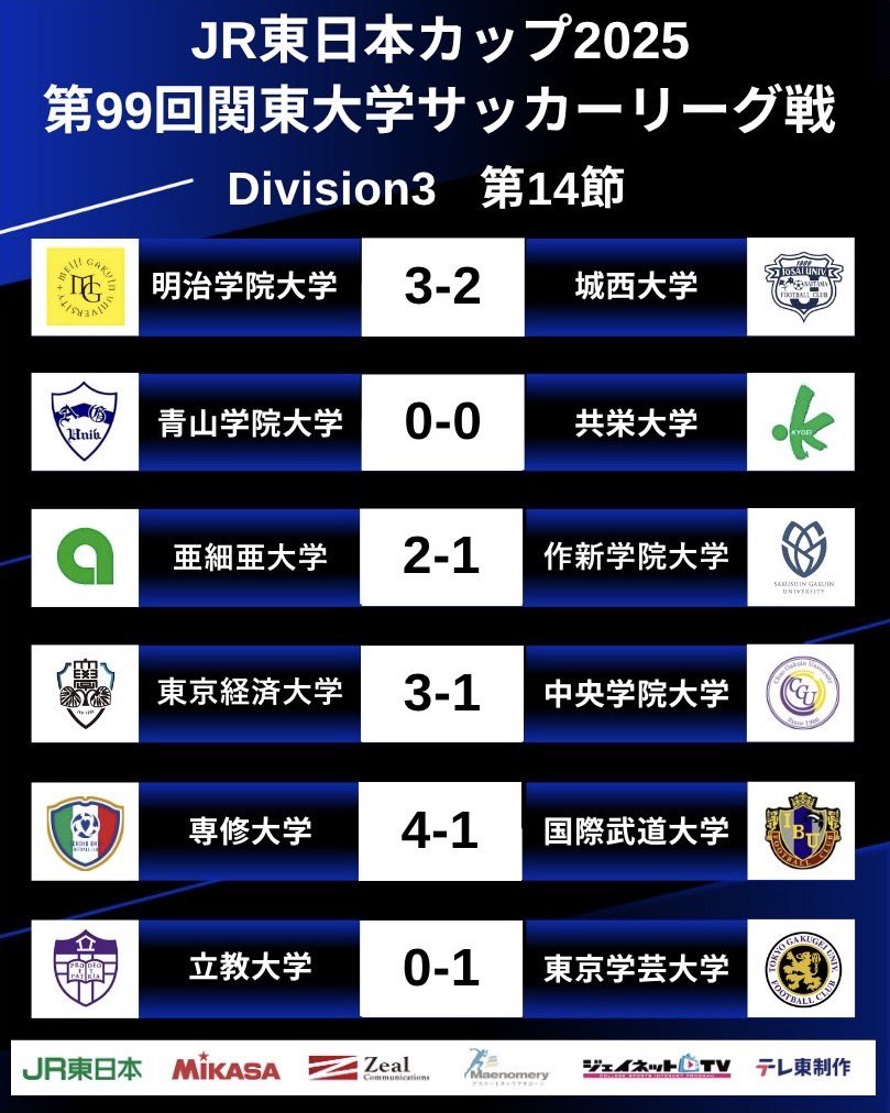 『JR東日本カップ2025 第99回関東大学サッカーリーグ戦』3部リーグ第14節は、10月4日(土)に全6試合が行われた。