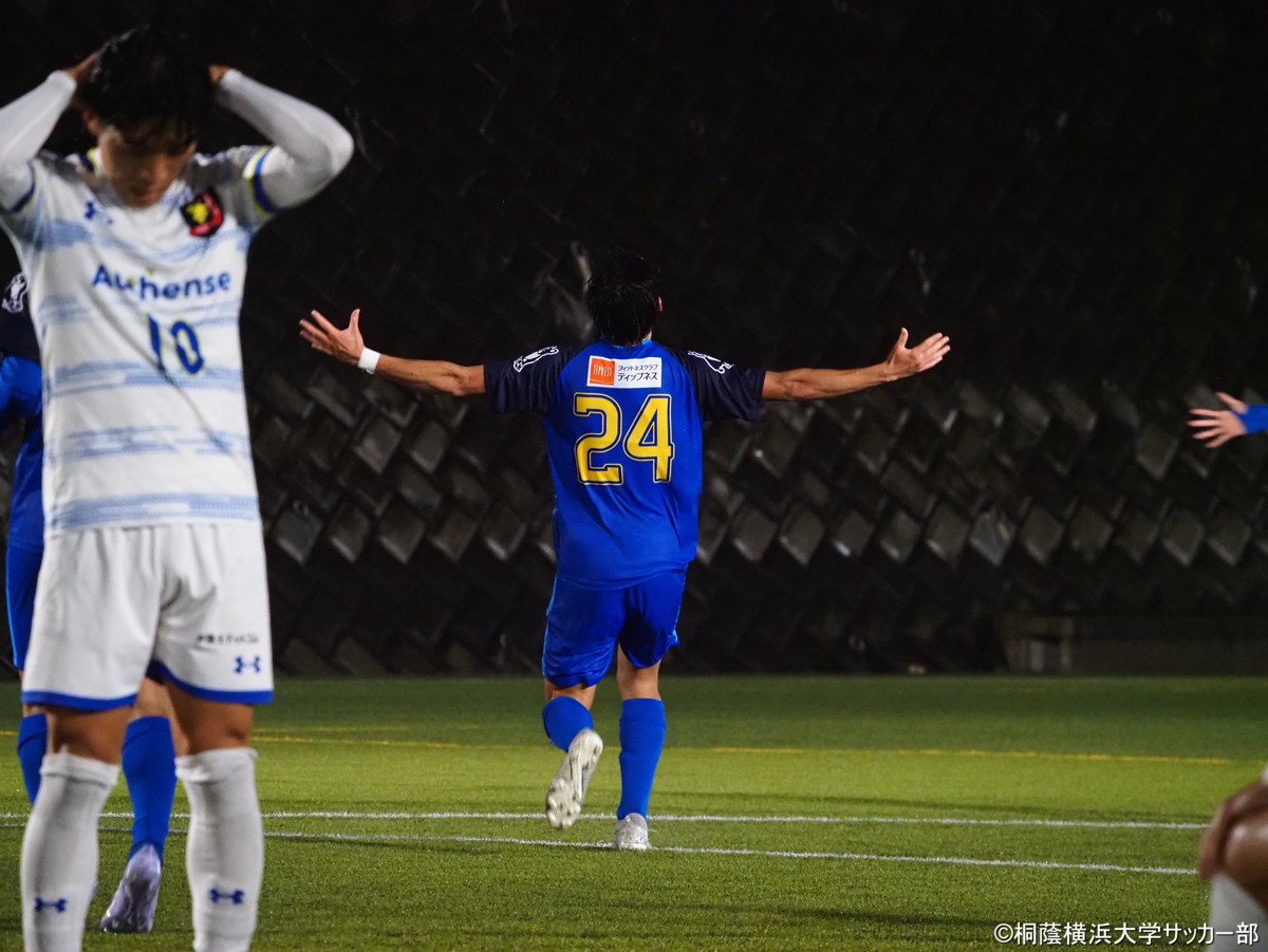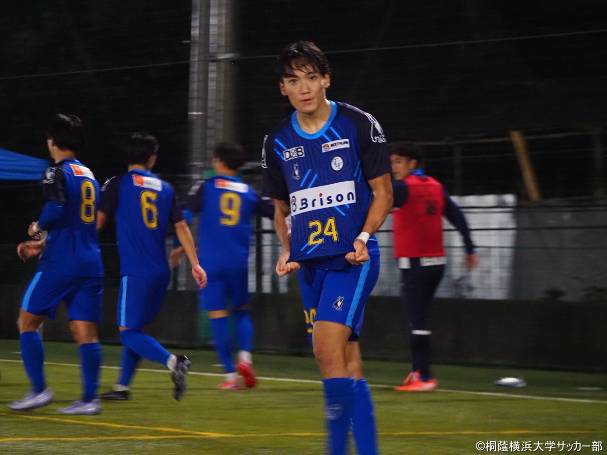8位・桐蔭横浜大学は、前節に9試合ぶりの白星を挙げ、連勝で最下位から抜け出したい慶應義塾大学と対戦。試合は、前節の勢いのまま慶大が積極的な攻撃を仕掛ける展開に。30分過ぎには連続のコーナーキックで桐蔭大ゴールを脅かすと、"3度目の正直"で角田惠風がゴール前に蹴り入れたキックを斎藤大雅が右足で合わせて先制点を挙げる。その後もたびたびセットプレーからチャンスを掴む慶大だったが、追加点は奪えず0-1のまま前半を終了する。後半は早い時間帯にスコアが動いた。47分、桐蔭大が左コーナーキックを獲得。池田柚生からのキックにゴール前は混戦となるが、GKが弾いたボールを田島慎之佑がすかさず蹴り込んでゴール。後半開始早々に桐蔭大が試合を振り出しに戻した。しかしその後は両チーム決定機を決めきれず、1-1のまま終盤に突入。すると80分、岡崎寅太郎がペナルティーエリア内で倒されて桐蔭大がペナルティーキックを獲得。83分、このチャンスを岡崎自身が決めて桐蔭大が逆転に成功する。1点を追う立場となった慶大だが、終了間際の89分に斎藤大雅が2枚目の警告を受け痛恨のレッド。数的優位に立った桐蔭大は慶大ゴールを攻め立てると、アディショナルタイムの90+4分、岡崎がDFを背負いながらも豪快なシュートを突き刺してこの試合2点目となるゴールを決める。終盤に試合を畳みかけた桐蔭大が3-1で勝利し、順位をひとつ上げて7位に。インカレ出場に向けて大きな1勝を挙げた。