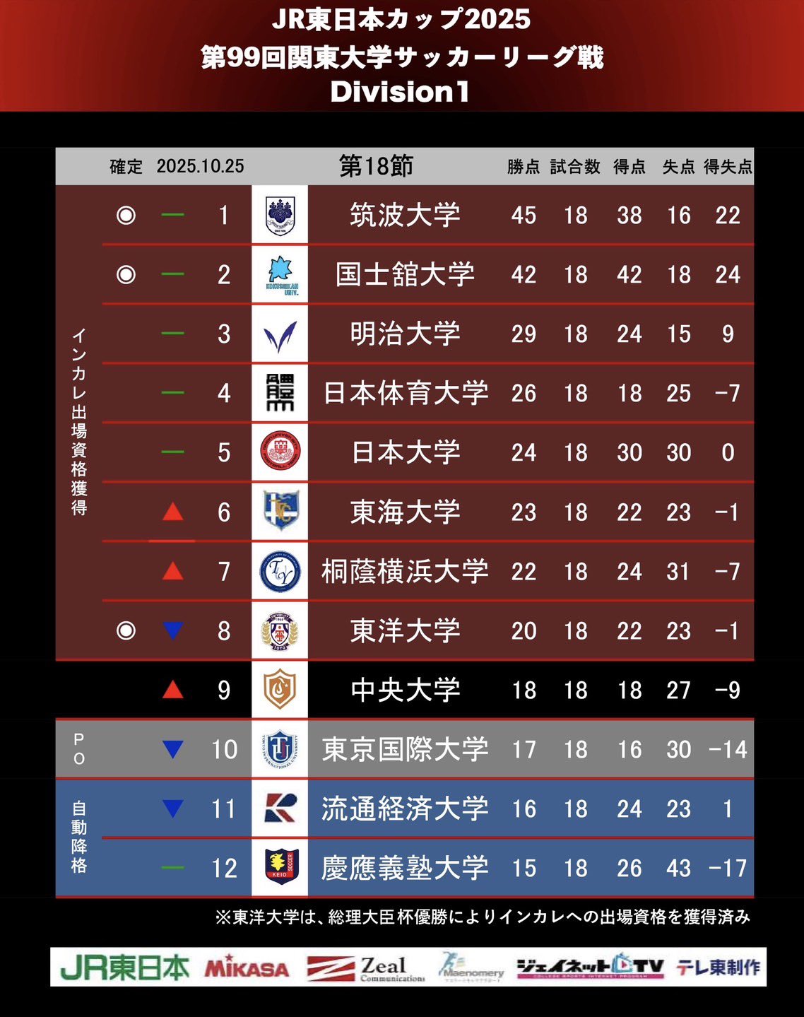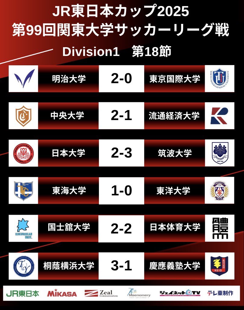 『JR東日本カップ2025 第99回関東大学サッカーリーグ戦』1部リーグ第18節は10月25日(土)に全6試合が行われた。