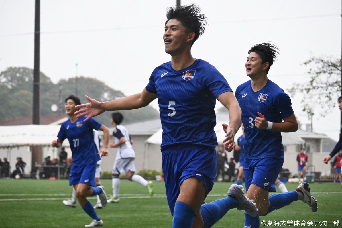 前節、総理大臣杯決勝以来となる白星を挙げた6位・東洋大学は同勝点で並ぶ7位・東海大学との直接対決。前半はどちらもチャンスを作りながらもゴールまで至らず0-0のまま前半が終了した。スコアが動いたのは後半序盤の52分。ホームの東海大は鳥取内定・星景虎が左サイドで突破を図りフリーキックを獲得する。キッカーは原田天。ゴール前に入れたキックを今治内定・丸山大和が頭で合わせて東海大が先制する。対する東洋大は宮本新や得点力のあるルーキー・香取武をピッチに送り出すが、堅固な東海大の守備を前にシュートまでもちこめず1-0のまま試合終了。東海大が連勝を4に伸ばした。また同勝点の直接対決を東海大が制したことで順位が入れ替わり、東海大は6位に浮上。東洋大は桐蔭横浜大学の結果により順位をふたつ下げて8位に後退した。