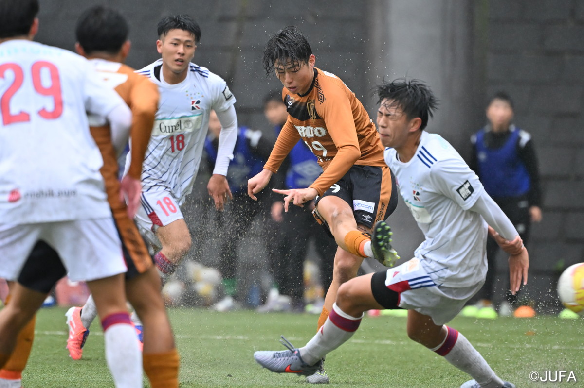 6連勝中の首位・筑波大学は2試合連続ドローの5位・日本大学と対戦。試合は立ち上がりからホームの日大が積極的に攻撃を仕掛けてチャンスを作る。28分、日大はショートコーナーからボールをつなぎ、石川晴大が頭でそらしたボールを齊藤航汰が合わせて先制。しかしその4分後、徐々に攻撃のペースを上げてきた筑波大は徳永涼がペナルティーエリアの外からミドルシュートを叩き込んで試合を振り出しに戻した。1-1のまま迎えた後半は、両チーム決定機を作りながらもゴールを決められず膠着状態に。その均衡が破られたのは終盤に差し掛かった75分。筑波大は途中出場・小松悠太のスルーパスに抜け出した大谷湊斗が、DFのマークをかわしゴール右隅にシュート。大谷の2試合連続となるゴールが決まり、筑波大が逆転に成功する。筑波大は80分にも、ペナルティーエリア内でこぼれ球を拾った清水大翔が豪快に蹴り込んで3点目。1-3と日大を突き放した。日大もその1分後に途中出場・中川粋のクロスがオウンゴールを誘い、2-3と1点差に迫るがあと1点が遠く2-3のまま試合終了。筑波大が逆転勝利で7連勝を飾り、首位の座を堅持した。