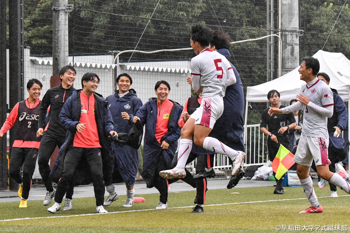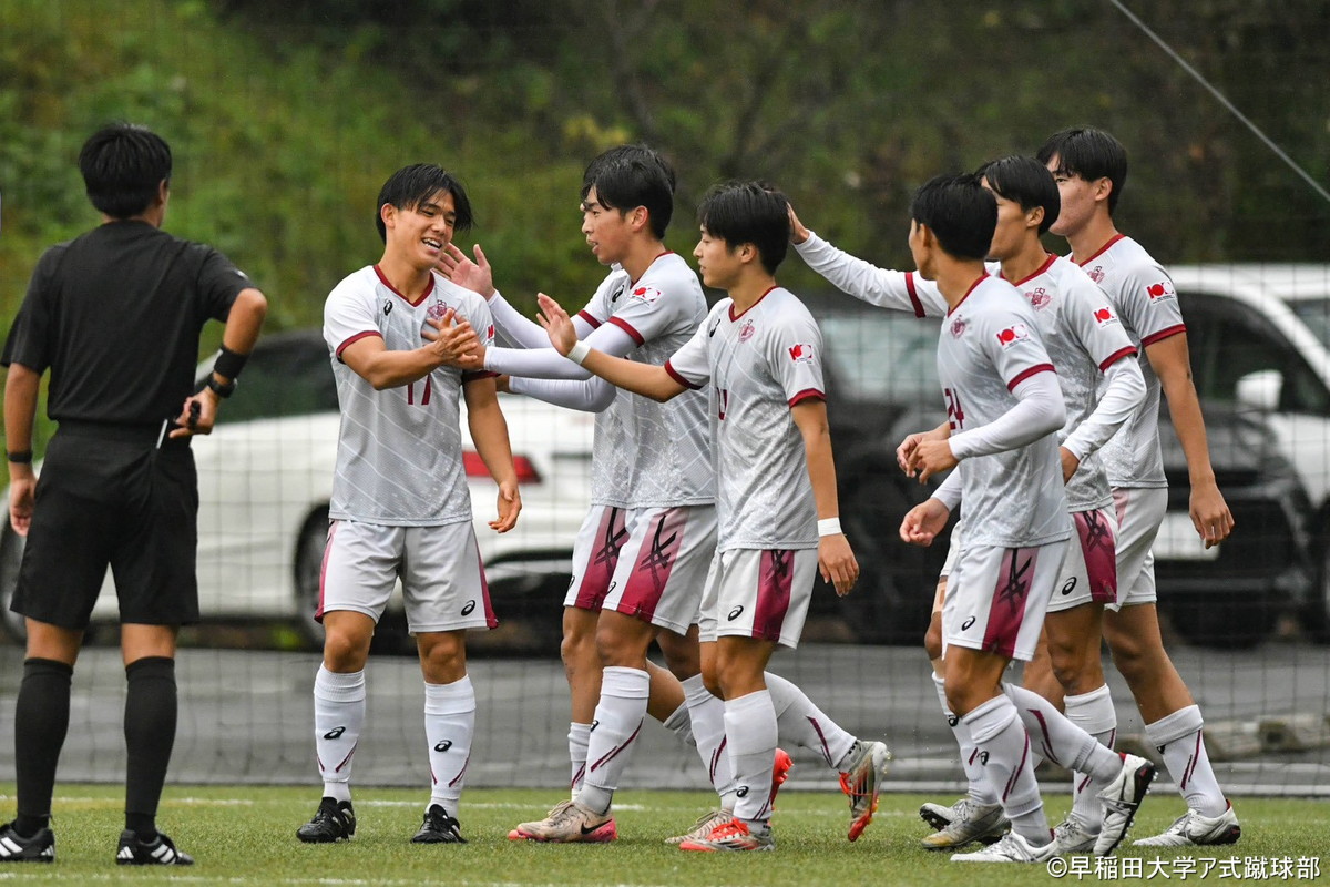 前節の結果、首位に勝点2差に迫った3位・早稲田大学は、2部残留に待ったなしの状態となっている12位・東京農業大学と対戦。首位・駒澤大学、2位・法政大学より1日早く行われたこの試合は、早大にとってライバルたちにプレッシャーを与えられる絶好の機会となる。立ち上がりから優位に試合を進め、何度となく東農大ゴールに迫る早大だったが、得点までは至らず0-0で試合を折り返した。突破口を探す早大はハーフタイム、久米遥太に代えて鳥取内定・本保奏希を投入。するとこの起用が的中し、早々に試合が動き始める。後半序盤の55分、早大は細かくパスをつないで前線にボールを運ぶと、伊藤稜介から左サイドの本保にボールを展開。本保がゴール前に入れたクロスを森田大智がダイビングヘッドで押し込み早大が待望の先制点を挙げる。その後は両チーム、選手を次々と入れ替えて流れを引き寄せようとするが、交代起用が奏功したのはまたもや早大だった。75分、早大・伊藤が放ったフリーキックは東農大に防がれるものの弾かれたボールを拾った本保がシュート。これは途中出場・佐久間真寛に当たるが、佐久間がすかさず体勢を入れ替えてシュートを流し込む。その後も早大は主導権を握り続け、危なげなく0-2で試合終了。これで3連勝となった早大が勝点3を積み上げて翌日の駒大、法大の結果を待つこととなった。一方、完敗を喫した東農の2部残留は、次節で引き分け以上の結果が必須。勝利しても上位の結果次第では3部降格が確定する厳しい状況となった。