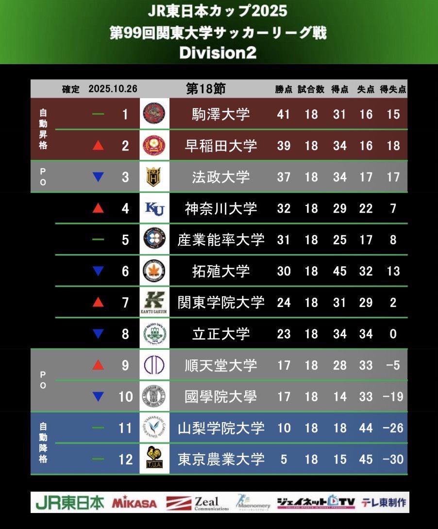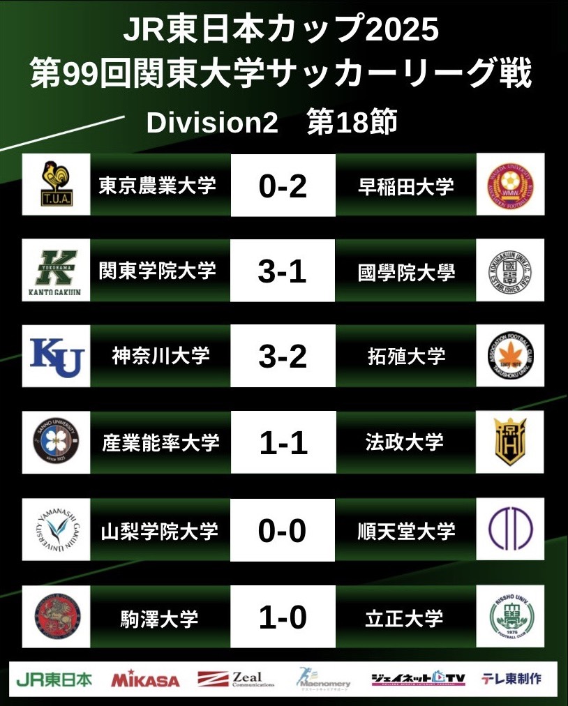 『JR東日本カップ2025 第99回関東大学サッカーリーグ戦』2部リーグ第18節は10月25日(土)に2試合、10月26日(日)に4試合が行われた。