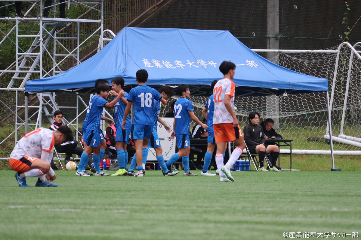 前節に連敗を喫し、ついに首位から陥落した2位・法政大学。ここ3戦負け無しと調子を上げている5位・産業能率大学との試合は、一進一退の拮抗した展開に。両チーム無得点のまま折り返すかと思われたが、前半終了間際の45+1分、産能大・保竹駿斗がハーフウェーライン付近でボールを奪うとそのまま持ち上がり、30メートル超のロングシュートを放つ。ボールはGKの頭上を越えてネットに突き刺さり、ホーム・産能大が先制して前半を終えた。ビハインドを負った法大は後半に入ると次々と交代選手をピッチに送り出すが、試合の流れは産能大に傾いたまま。試合はアディショナルタイムに突入。産能大がこのまま逃げ切り、法大が3連敗かと思われた。だが90+3分、法大はGK寺田周太がゴール前にロングキックを放つと、ワンバウンドしたボールを清水内定・大畑凜生が強烈なボレー。土壇場で法大が同点に追いつき3連敗を免れた。勝点1を積み上げた両チームだが、前日の試合で同勝点の3位・早稲田大学が勝利しているため法大は2位から3位に後退した。